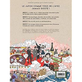 La bible de la cuisine japonaise mais surtout un melting-pot ultra vivant et complet qui aborde toutes les facettes de la culture gastronomique japonaise. Des photos, des illustrations, des portraits, des anecdotes, des histoires, plusieurs centaines de recettes, des tours de main, des pas à pas des adresses, des cartes, des photos reportage, des leçons (apprendre à faire le dashi, apprendre à découper les fruits et légumes, réaliser des gyozas, faire des sushi comme un maître sushi…). De nombreux intervenants japonais (producteur de saké, producteur de sauce soja, spécialiste de sumie, producteur de yuzu, sumo…). Pour toute savoir sur la gastronomie nippone et l’art de vivre à la japonaise. Un livre unique !