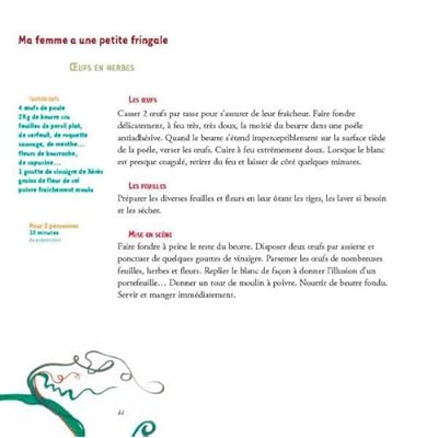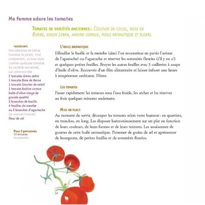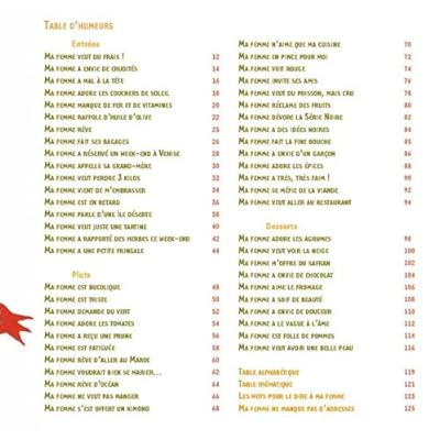 Voici le livre d'un homme à l'écoute de sa femme. Un livre de recettes en situation : à chaque humeur, sa recette correspondante. Désire-t-elle perdre 3 kilos ? Il lui prépare une soupe de tomates picotée de vinaigre violet. Elle a réservé un week-end à Venise ? Vite, une salade de fraises et de tomates ! Et si elle est triste, une purée de pommes de terre avec vanille, safran, et fromage blanc pourrait bien lui rendre le sourire. En 52 recettes savoureuses et originales proposées page après page, ce livre de cuisine pas comme les autres conjugue un propos délibérément poétique avec les illustrations pleines de fantaisie et de couleurs de l'artiste d'origine russe Irina Volkonskii. Une manière délicieuse et inédite de conjuguer amour de la table et amour tout court.